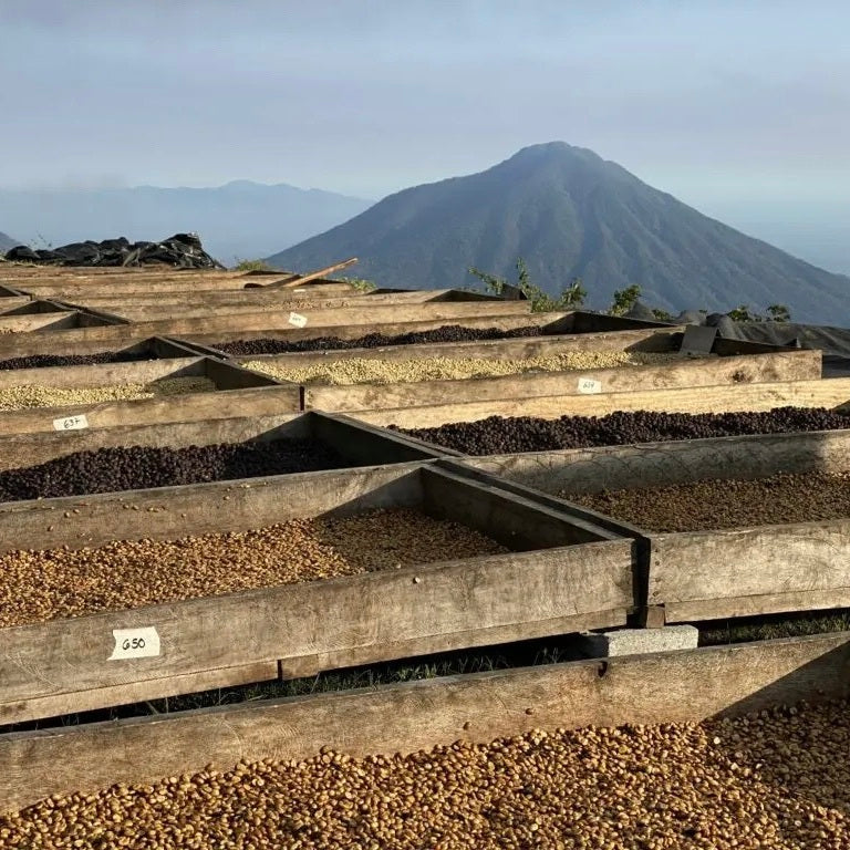 Our Pacamara lot underwent Black Honey processing. After harvest, ripe cherries are pulped but almost all of the mucilage is left intact. The pulped coffee is then spread in a thin layer on shaded raised drying beds. The shade slows the drying process compared to the other Honey processes used on the farm. Coffee is dried for approximately 25 days until it reaches ideal humidity and the mucilage has turned sticky and black, giving the process its name.