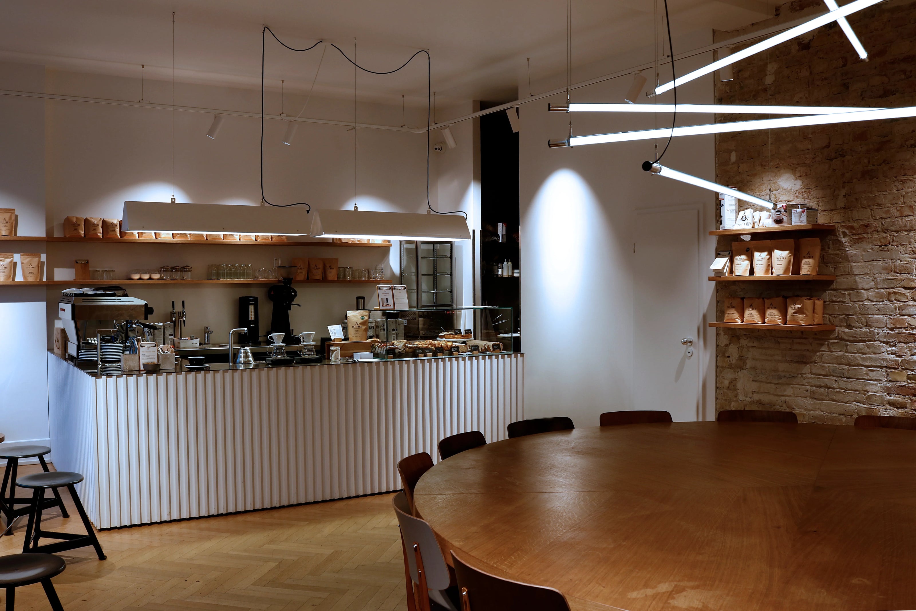 The centerpiece of our café is a large communal table that seats 15 people, with additional benches that run alongside the big windows. Clean design contrasts raw brick walls and the oak wood of the large table - a nod to our pure coffees. The wide pavement allows great seating under the old trees. Soak in the atmosphere of Neukölln and slow down over a great cup of coffee!