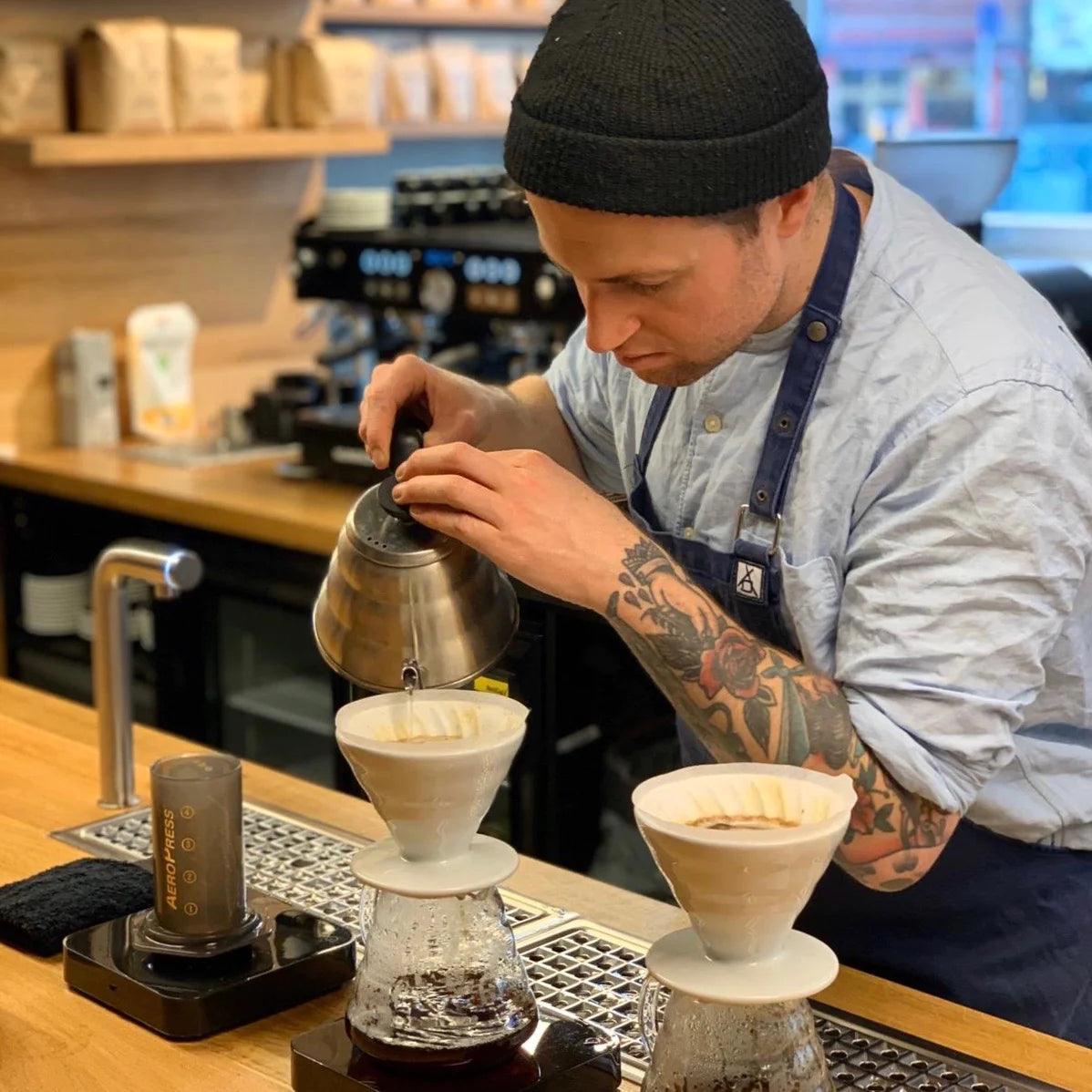 Behind the bar you will find a La Marzocco PB-X espresso machine, Mythos 2 and EK43 grinders, and a slick Marco Brew Bar for our hand brews. From our own kitchen, there is a great selection of homemade sandwiches, cakes and fresh juices, as well as teas. Vegan options are available. The retail shelves are always stocked with freshly roasted beans and our favourite brew equipment.