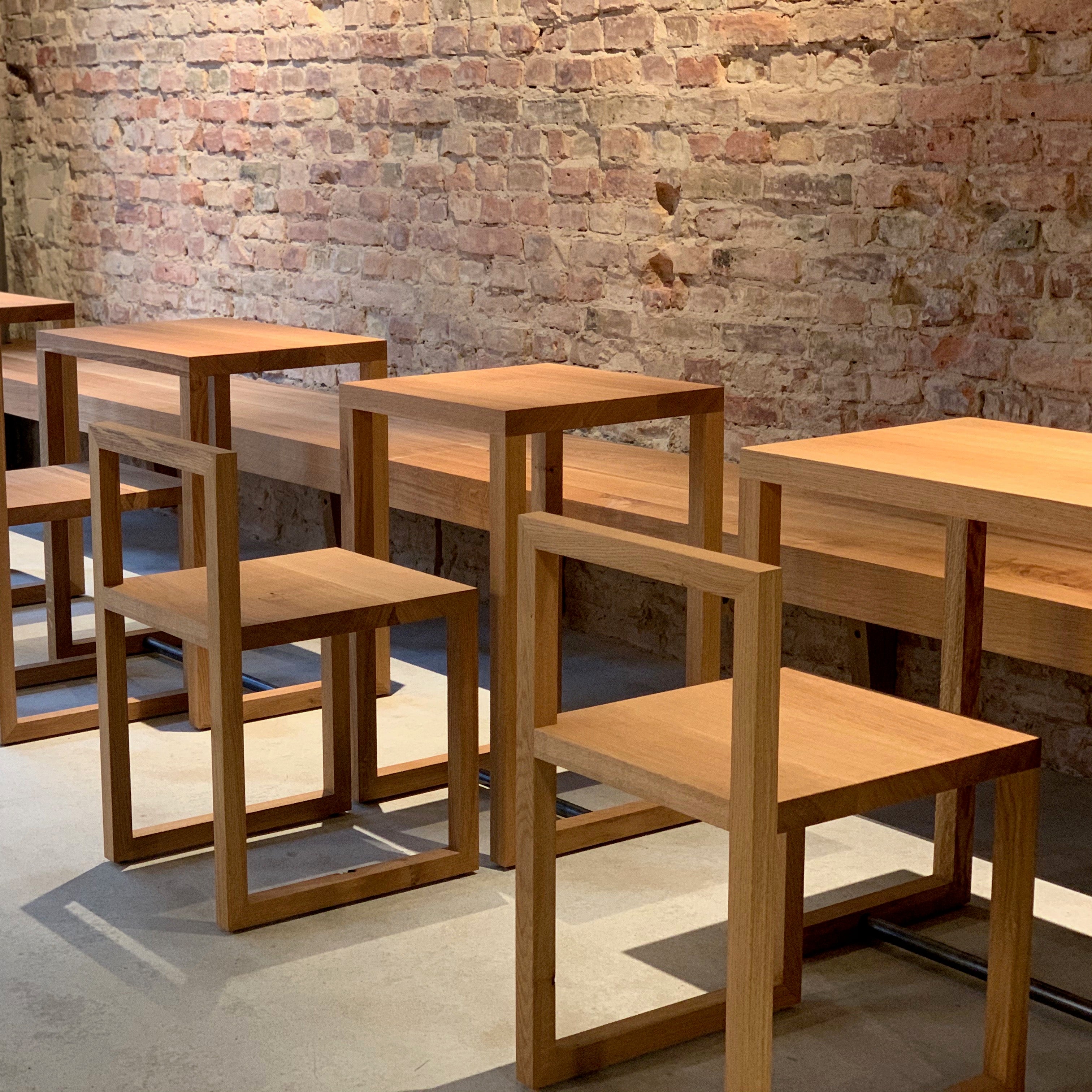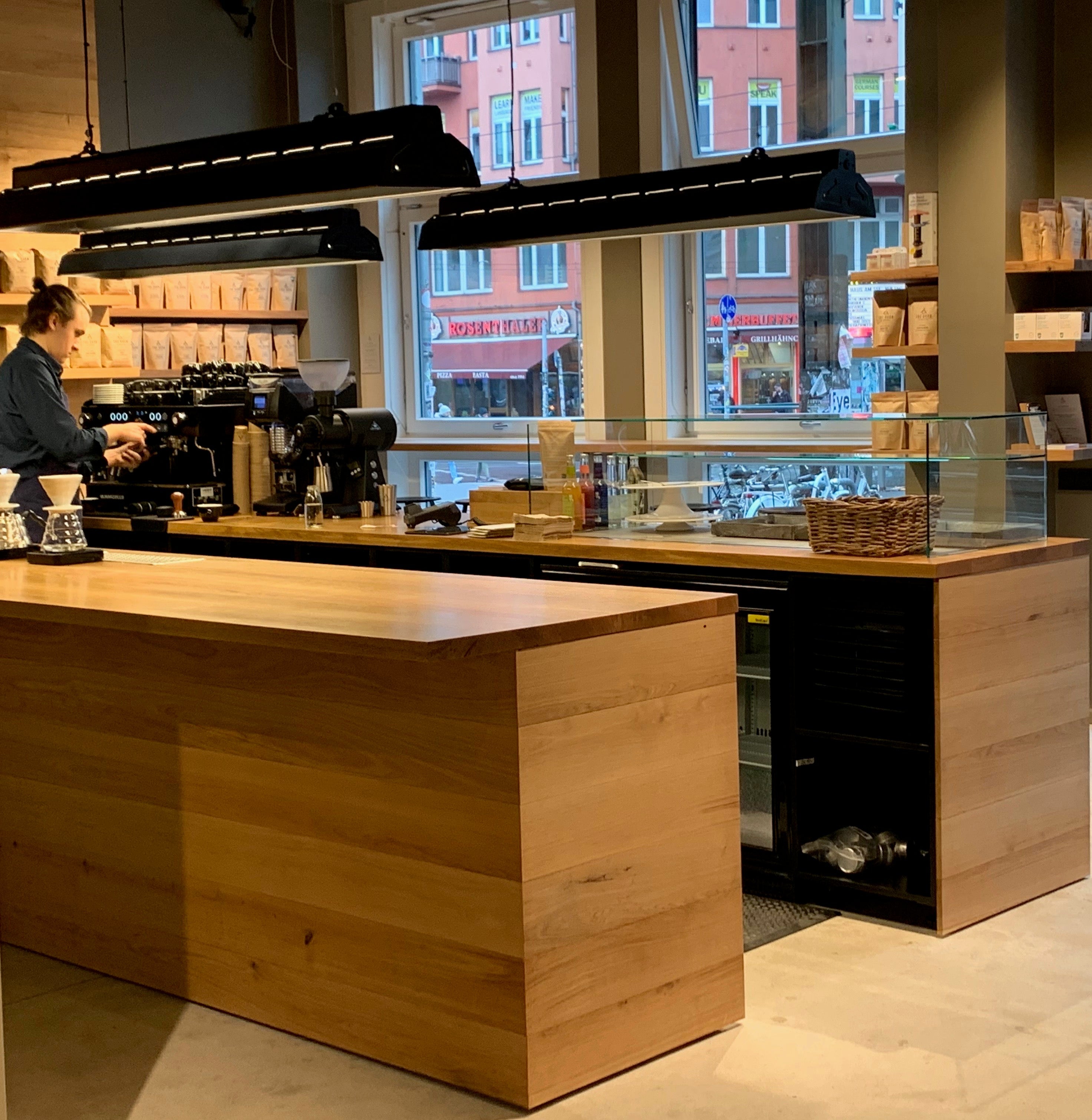 The café will offer a wide array of seating options, complete with a quiet reading room in the back of the café. The open bar seats up front invite you to get close to the action; watching as our baristas carefully prepare their handbrewed coffee. Huge sash windows will bring the atmosphere from the pavement into our space. Our chairs and tables are our own unique design, and crafted by our local Berlin carpenter.