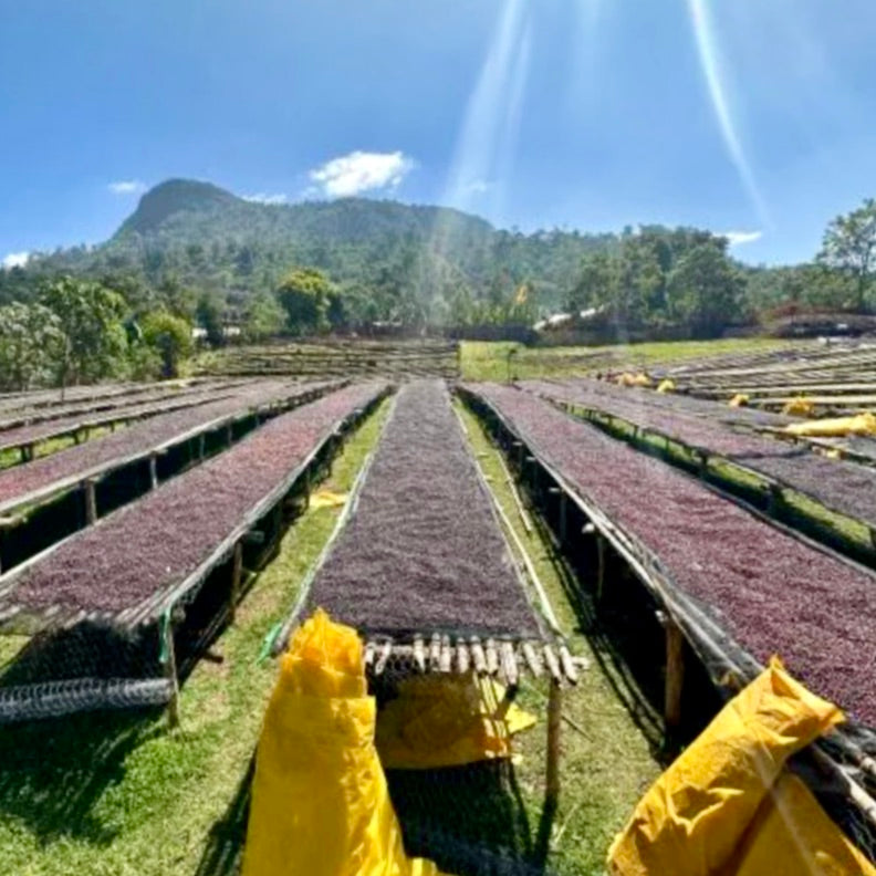 The cherries are typically delivered the day they are harvested, and are first sorted for ripeness and quality before being rinsed clean of dirt. Then they are spread on raised drying beds or tables, where they will be rotated constantly throughout the course of drying. Drying can take an average of 8–25 days, depending on the weather.
