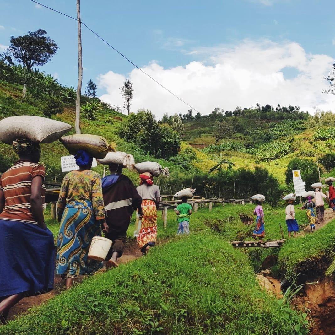 Within the Gatare community, smallholder farmers deliver their cherries to the Mahembe washing station for processing. The farms are predominantly small, family-run operations. Families manage plant care and cherry picking, often cultivating additional crops for personal consumption.
