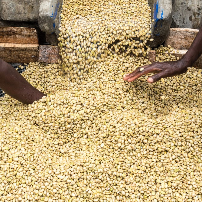 After washing and grading, parchment is laid to dry on raised beds. Workers rake parchment frequently to ensure even drying. They cover drying parchment during the hottest time of day, to maintain slow, even drying and at night, to shelter parchment from moisture. It takes approximately 14 days for parchment to dry.